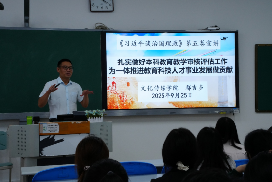 宣讲会上,鄢吉多书记系统解读了《习近平谈治国理政》第五卷的核心要义,重点阐述了习近平新时代中国特色社会主义思想的最新发展,强调该书是理解中国之路、中国之治、中国之理的重要理论成果。他特别指出,教育、科技、人才是全面建设社会主义现代化国家的基础性、战略性支撑,党的二十大报告将其作为专章部署,凸显了教育在强国建设中的根本地位。