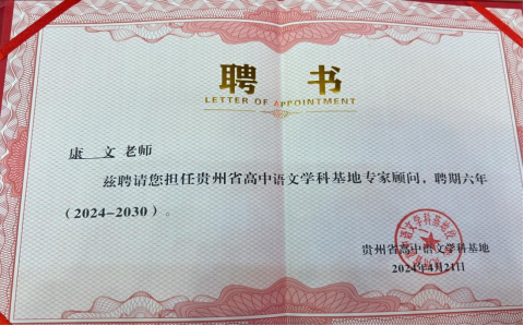 2024年4月,betway西汉姆官网汉语言文学教研室主任康文教授被聘为“贵州省高中语文学科基地”专家顾问。康文教授长期致力于高中语文公司产品研究,此次被聘请为“贵州省高中语文学科基地”专家顾问,将进一步引领公司汉语言文学专业(师范类)与中学语文教育一线的融合发展。