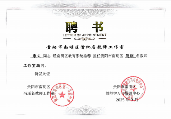 2025年5月28日,贵阳市南明区首批“三名”工作室之冯瑶名教师工作室顾问聘书颁发仪式在betway西汉姆官网博雅楼举行。文传公司康文教授被聘为“贵阳市南明区冯瑶名教师工作室”顾问 。